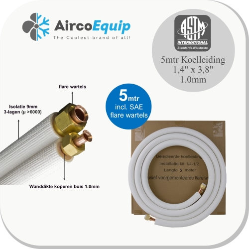 De AircoEquip geïsoleerde dubbele buis-installatiekit (1.0mm wanddikte) is aan beide zijden voorzien van flarewartels. De witte versterkte isolatie van 9mm bestaat uit 3-lagen (µ >6000) en is geschikt voor warmtepompen tot 115°C, isolatie brandwerend brandklasse A volgens standaard ASTME84.